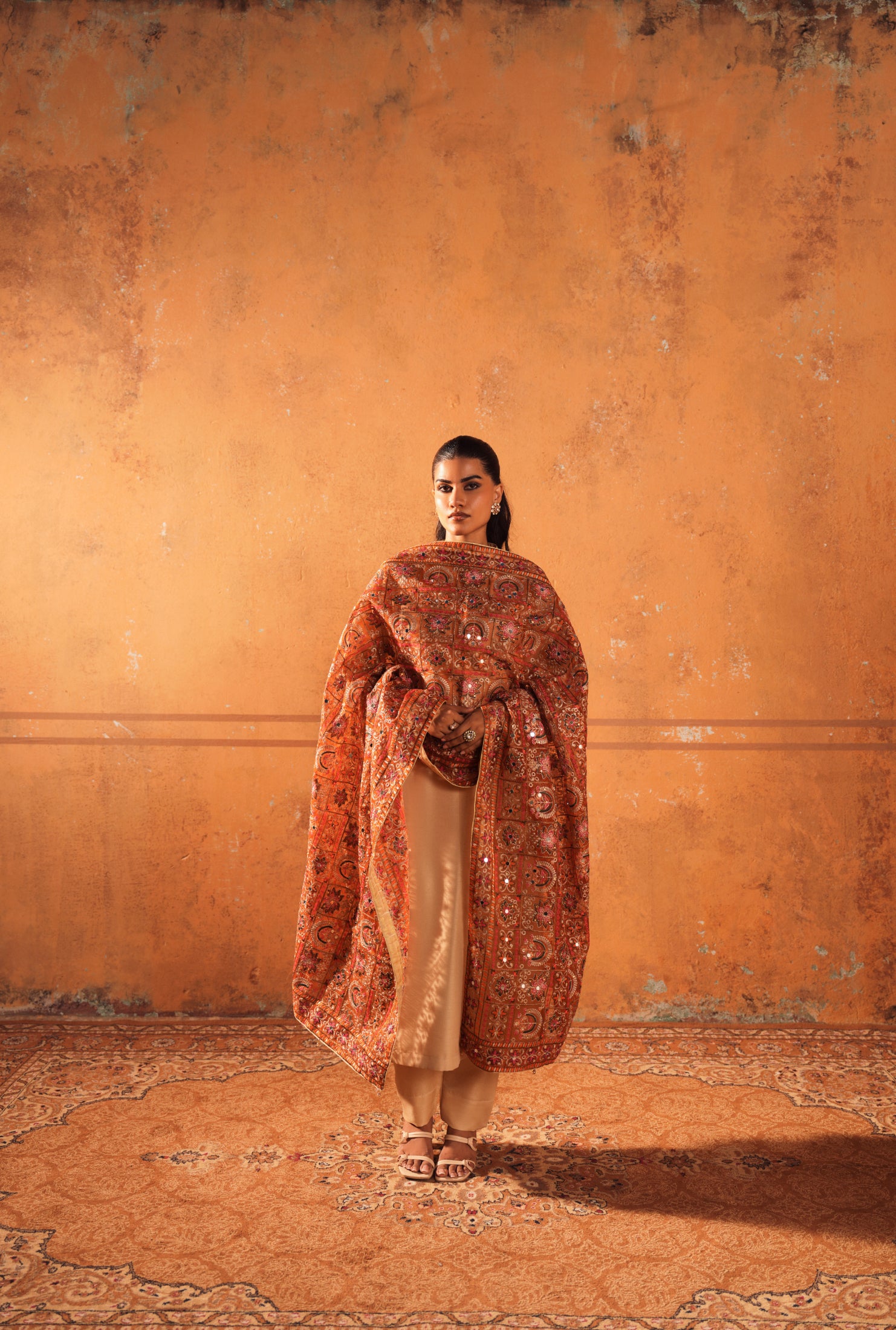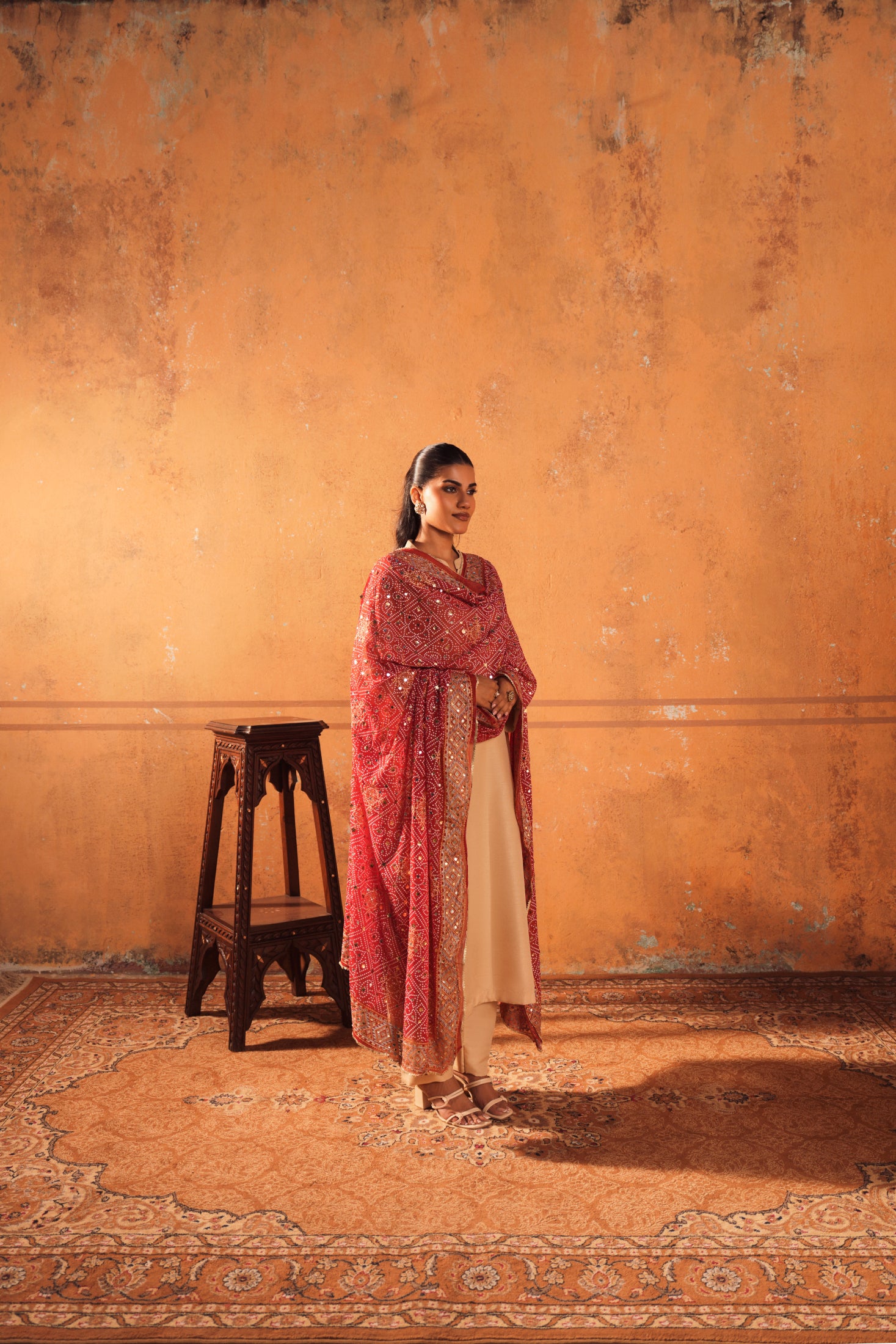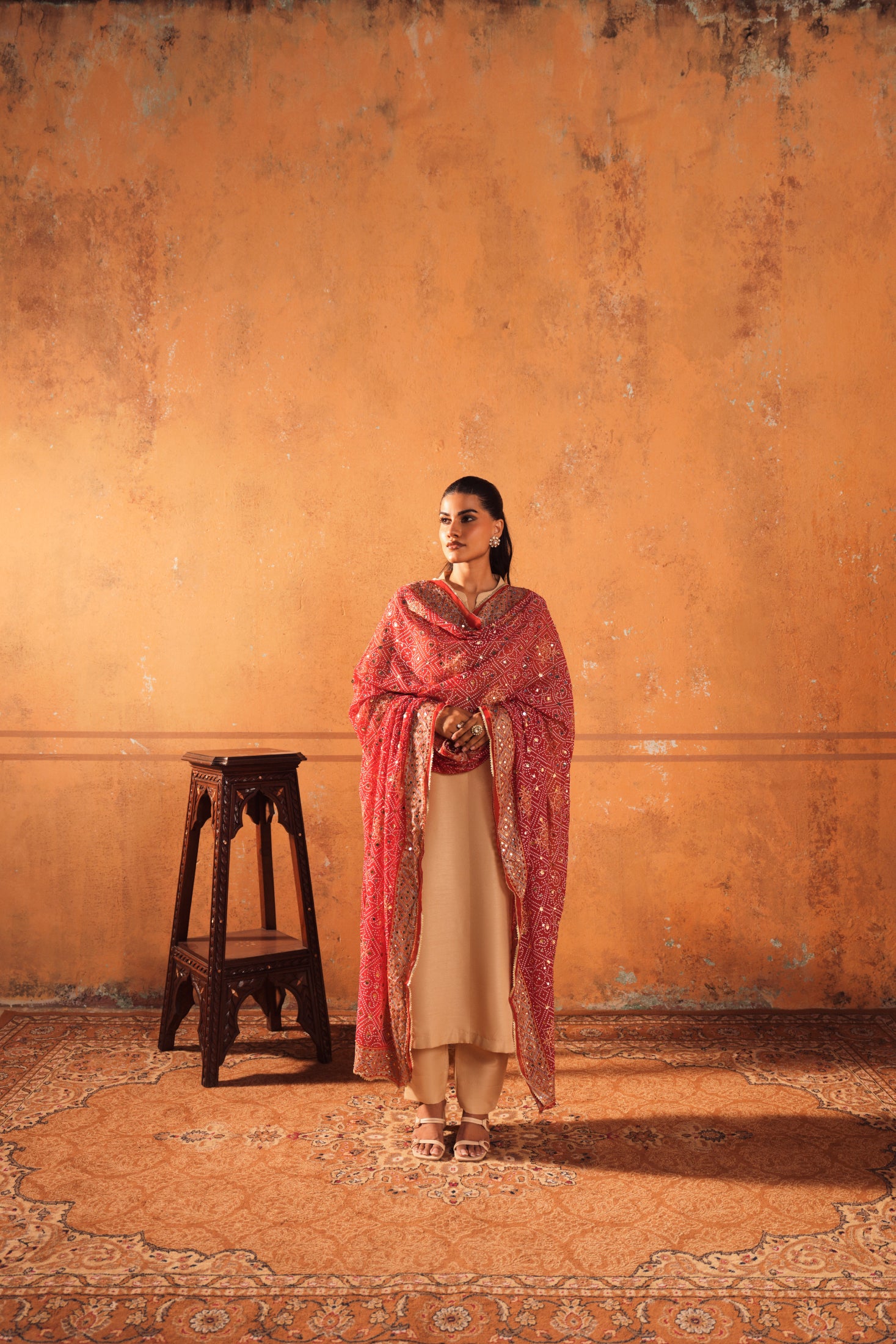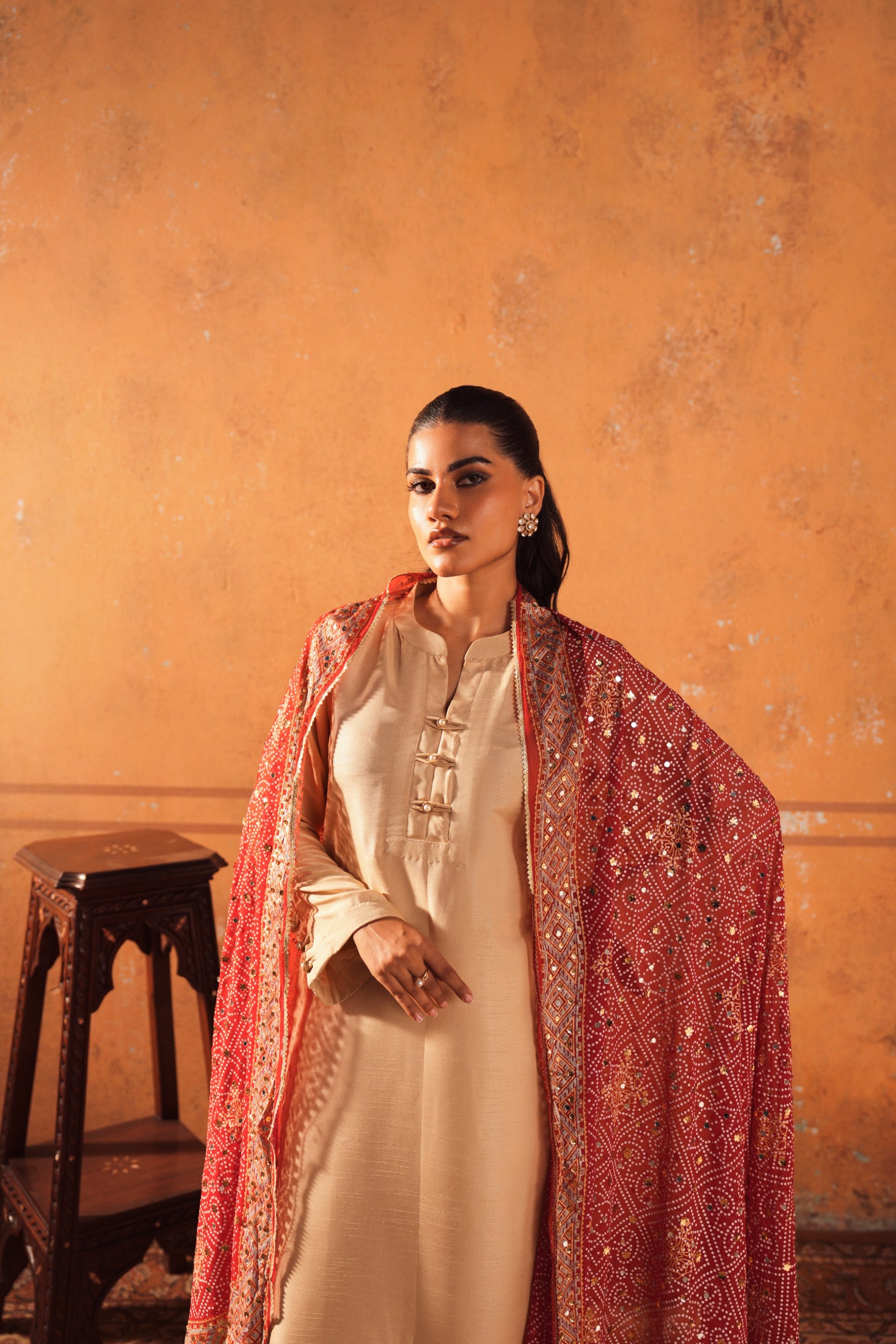 The silk shirt with trouser and embellished dupatta radiates understated elegance with a touch of festive sparkle. This versatile ensemble is perfect for wedding parties, offering comfort, style, and a refined statement in every detail.