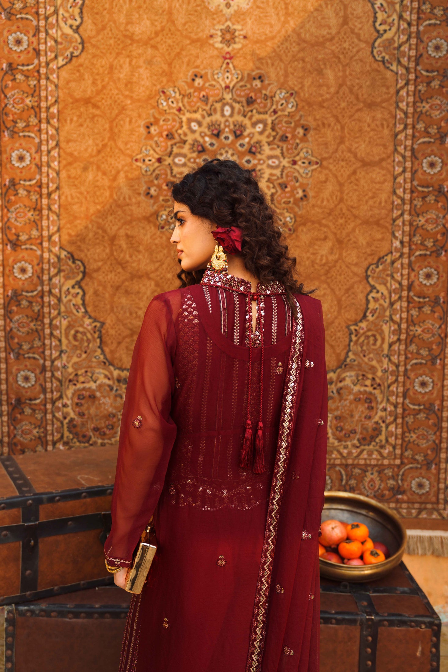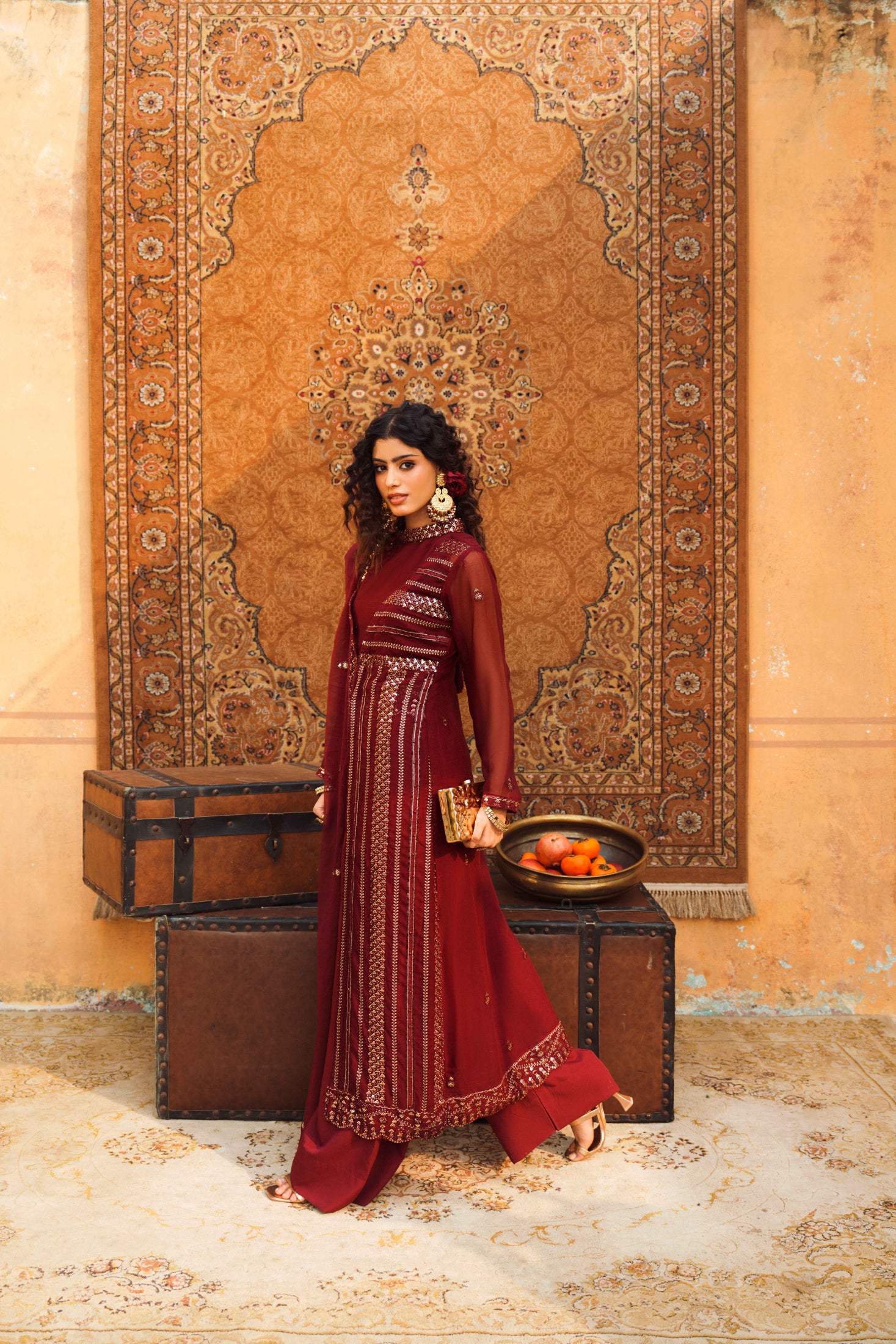 The embellished open long gown in chiffon, paired with flared trousers and an adorned blouse, radiates graceful luxury. This ensemble moves beautifully at every wedding party, blending airy fabric and intricate details for a truly standout look.