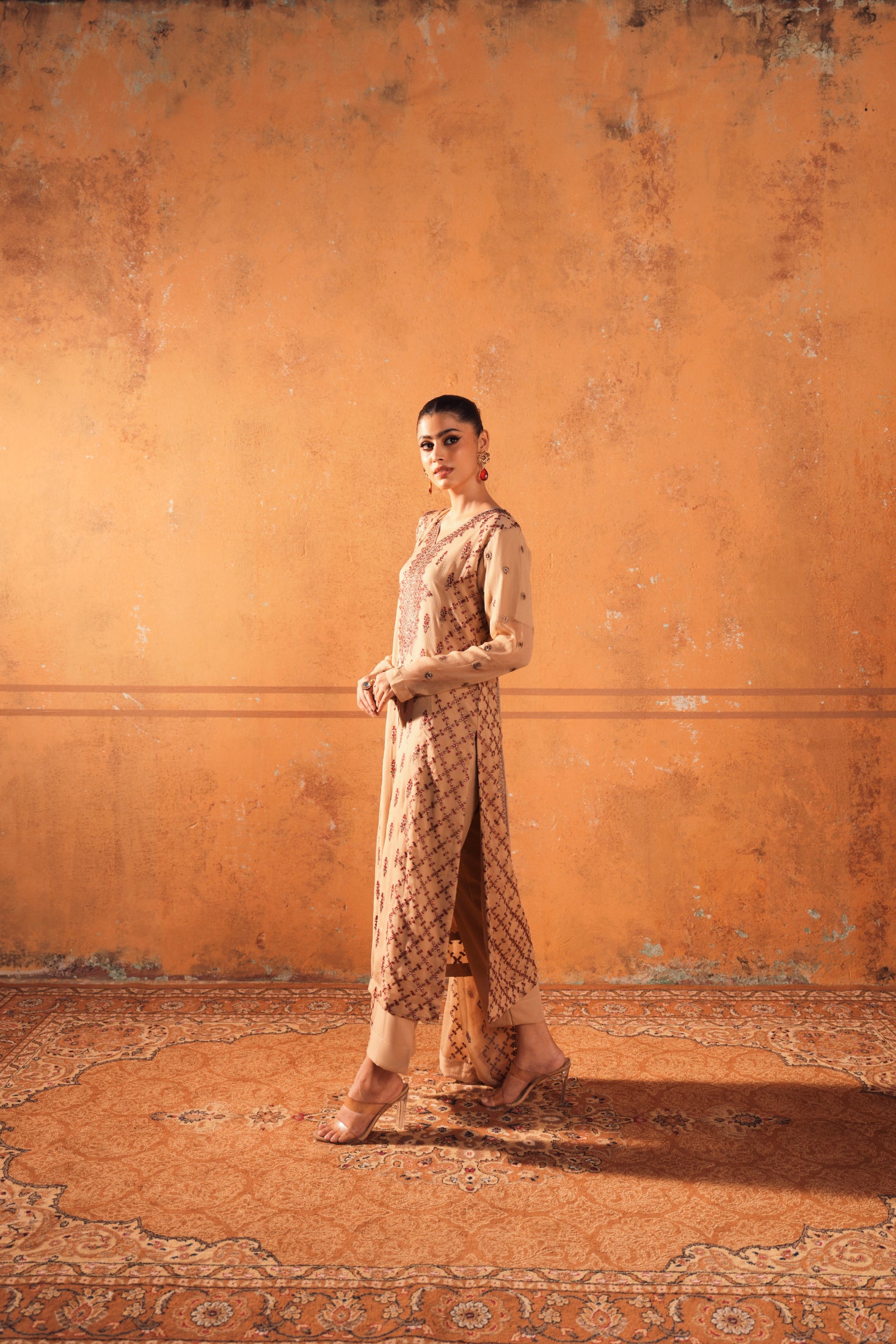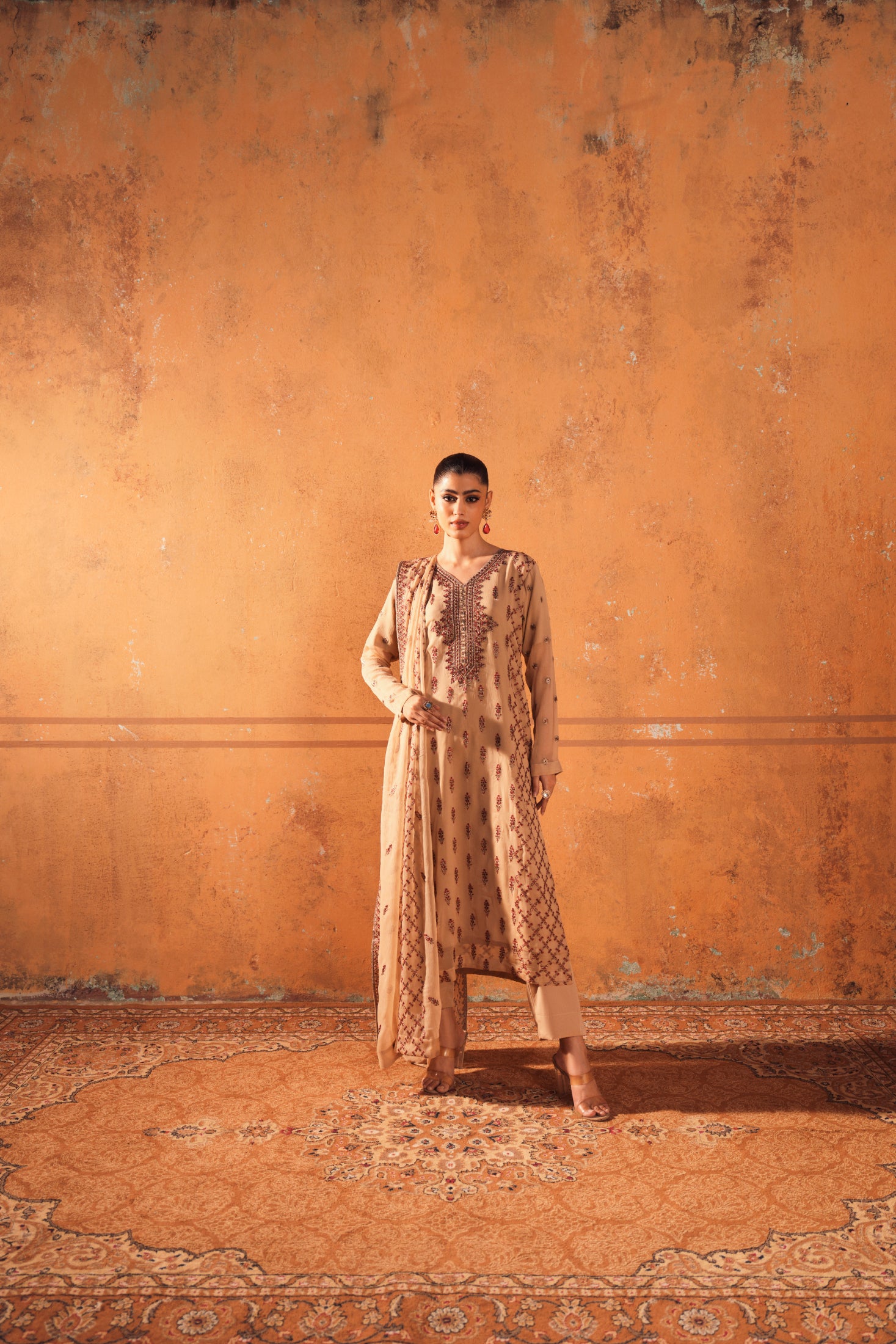 The shirt, trouser, and dupatta combination offers a sleek and modern wedding party look. Clean lines and subtle embellishments create a refined outfit suitable for stylish guests.