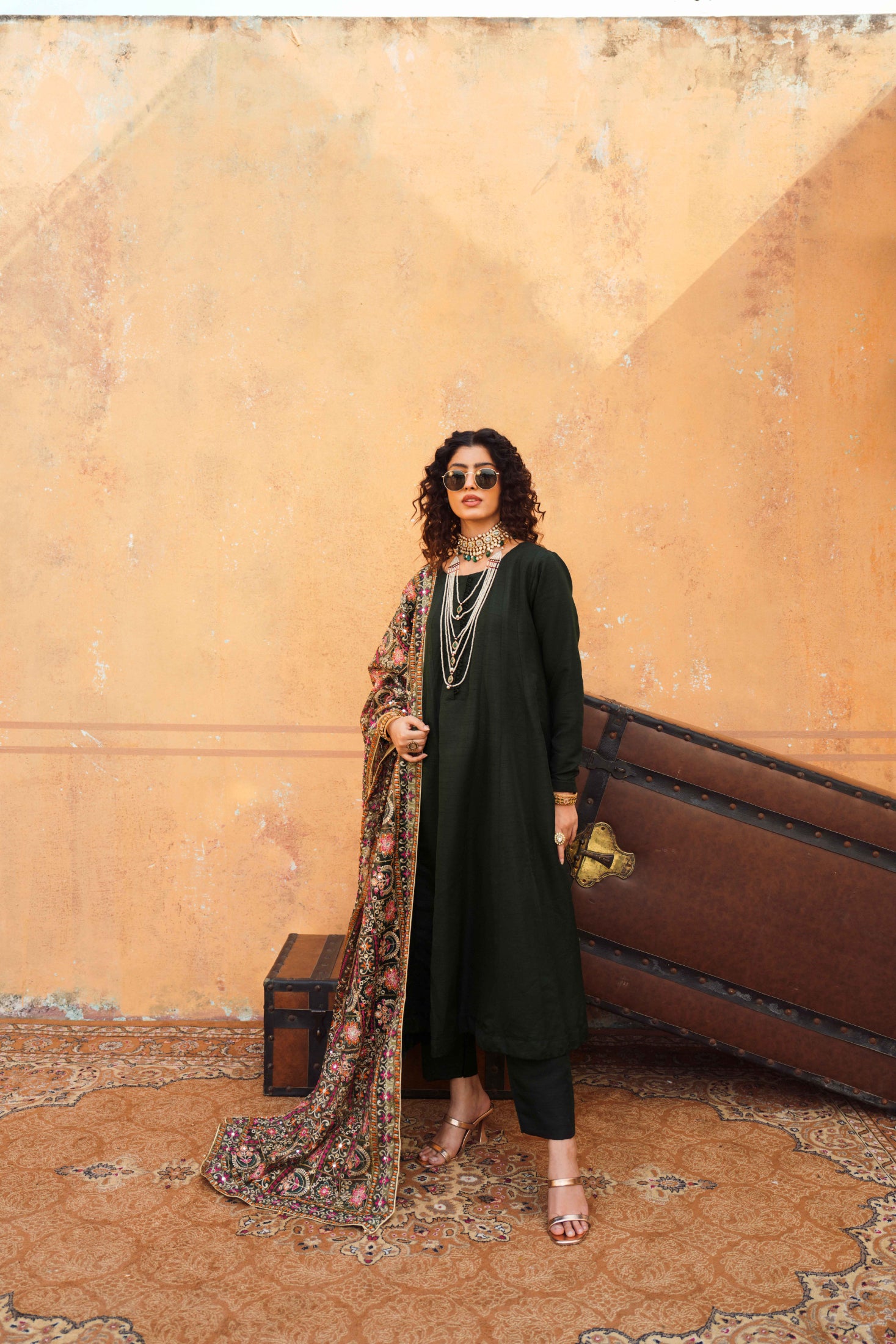 The silk kali frock paired with a capri and embellished dupatta offers a modern twist on festive elegance. Its flowing silhouette and detailed accents make it a standout choice for wedding parties, balancing contemporary style with traditional charm.