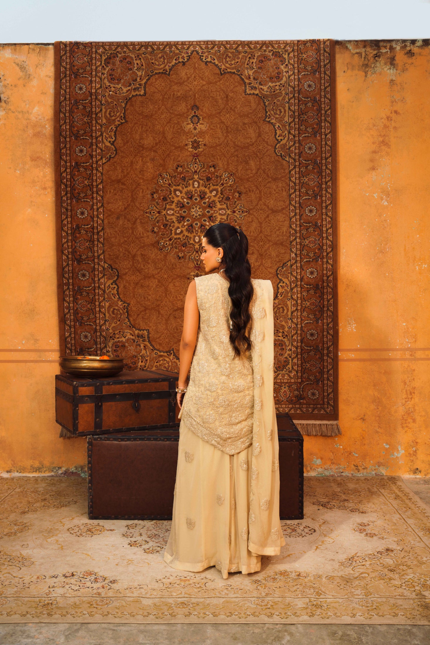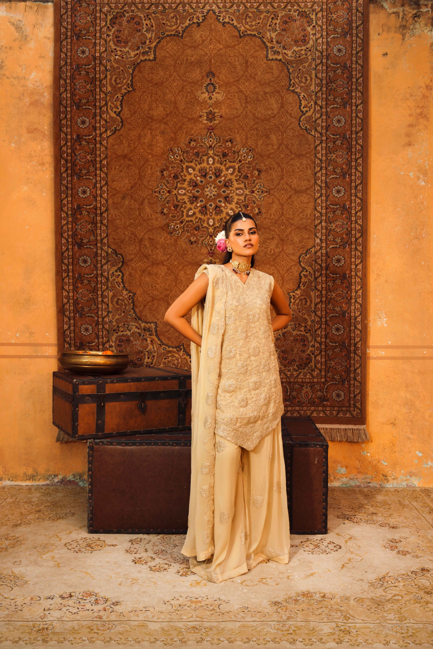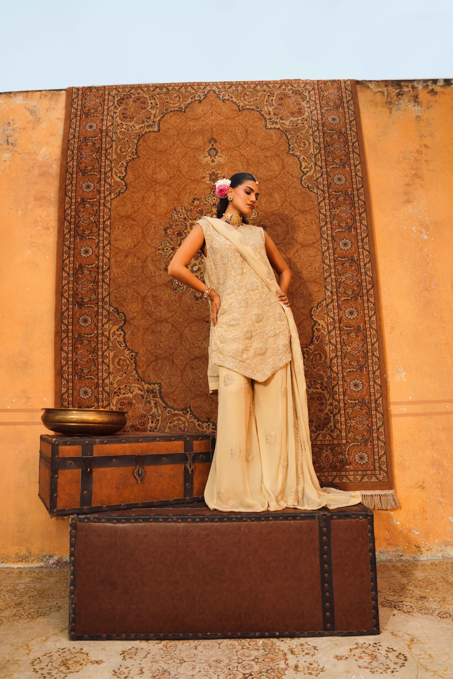 The sleeveless shirt paired with kali plazo offers a chic and contemporary silhouette for party occasions. This combination blends comfort and style effortlessly, perfect for vibrant wedding celebrations.
