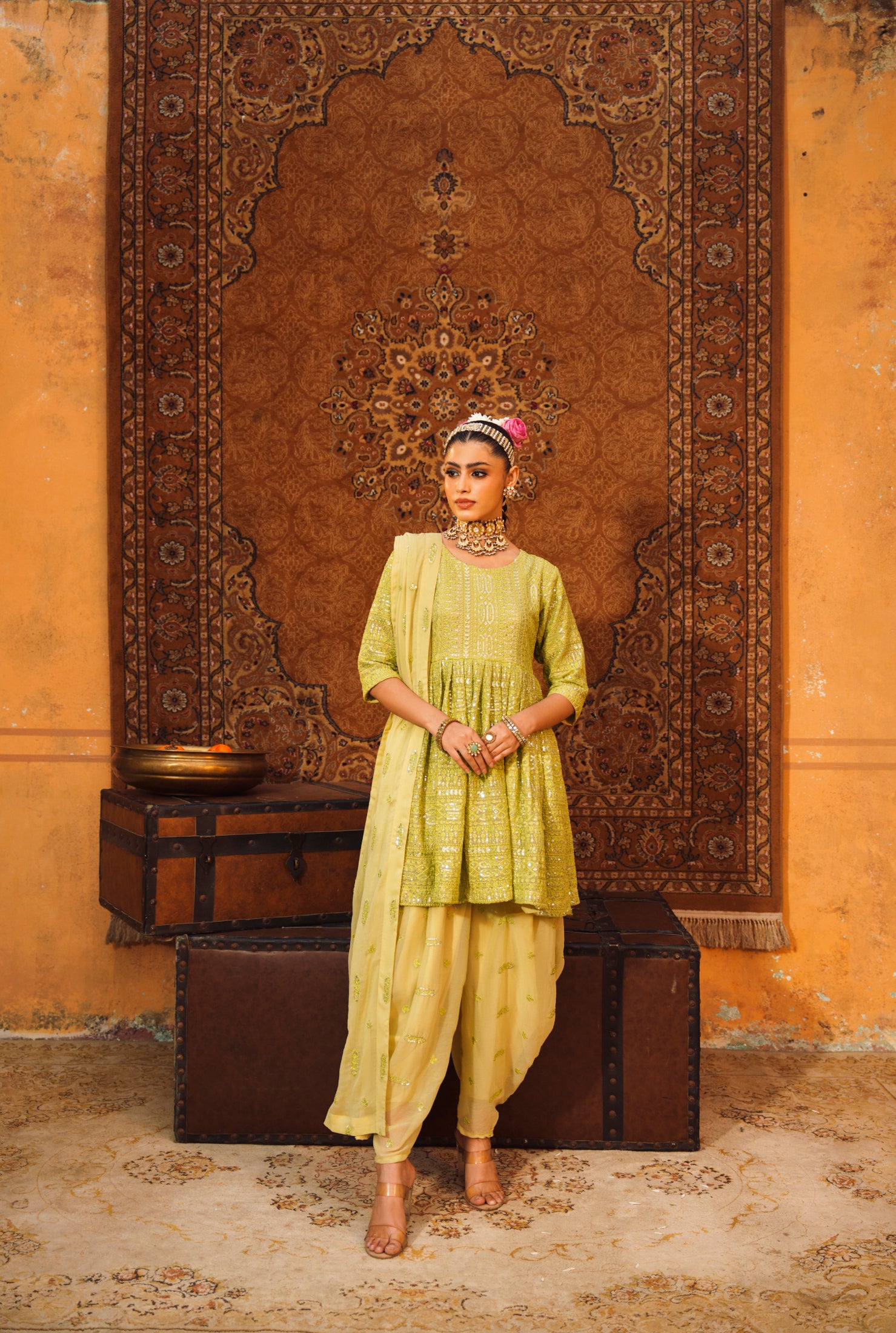 The short frock paired with tulip shalwar strikes a perfect balance of playful elegance and modern tradition. Its unique cut and comfortable fit make it ideal for lively wedding celebrations.