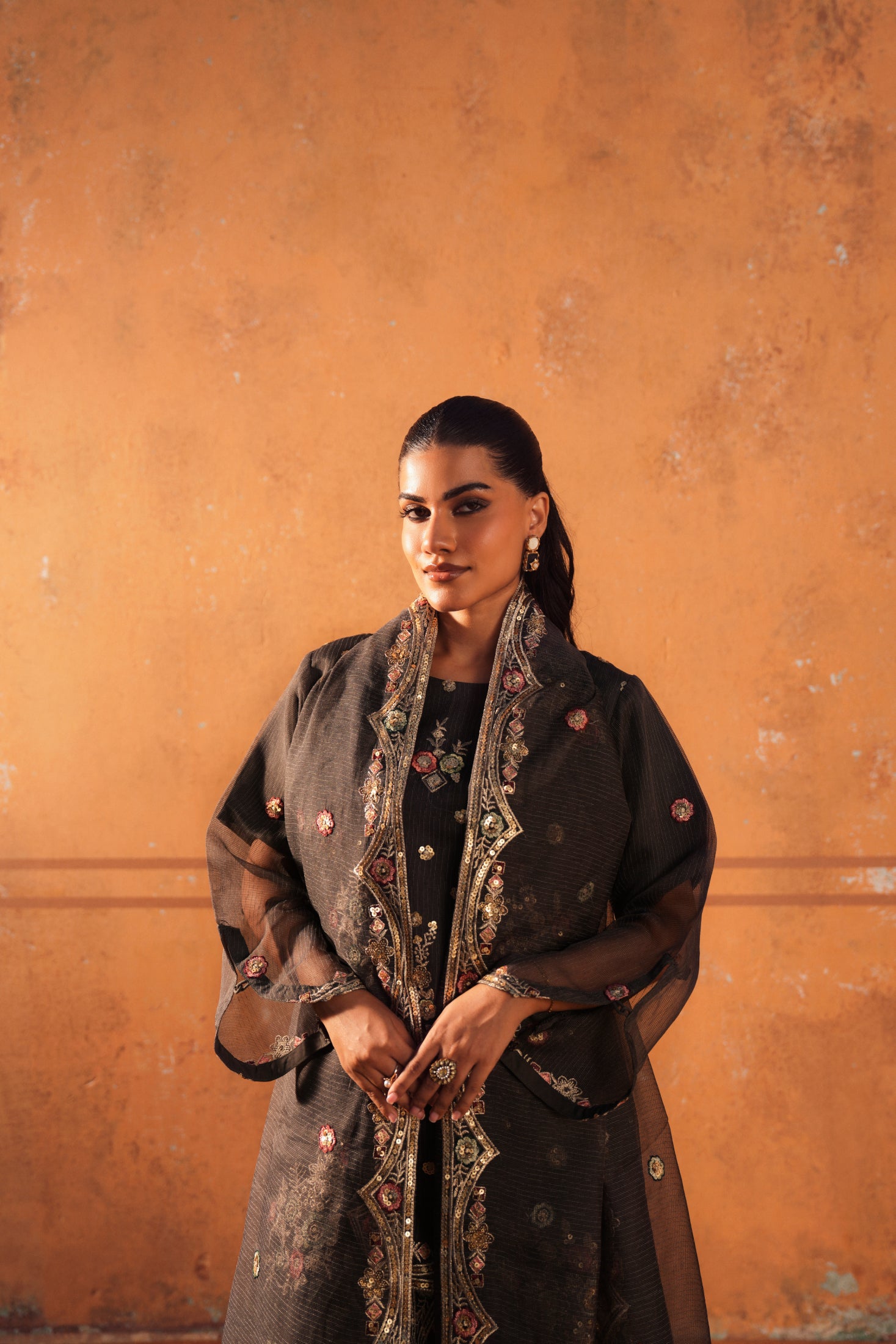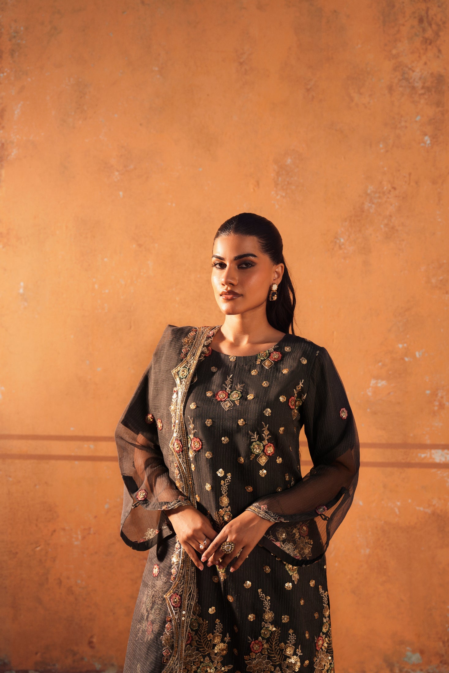 The shirt, trouser, and dupatta combination offers a sleek and modern wedding party look. Clean lines and subtle embellishments create a refined outfit suitable for stylish guests.