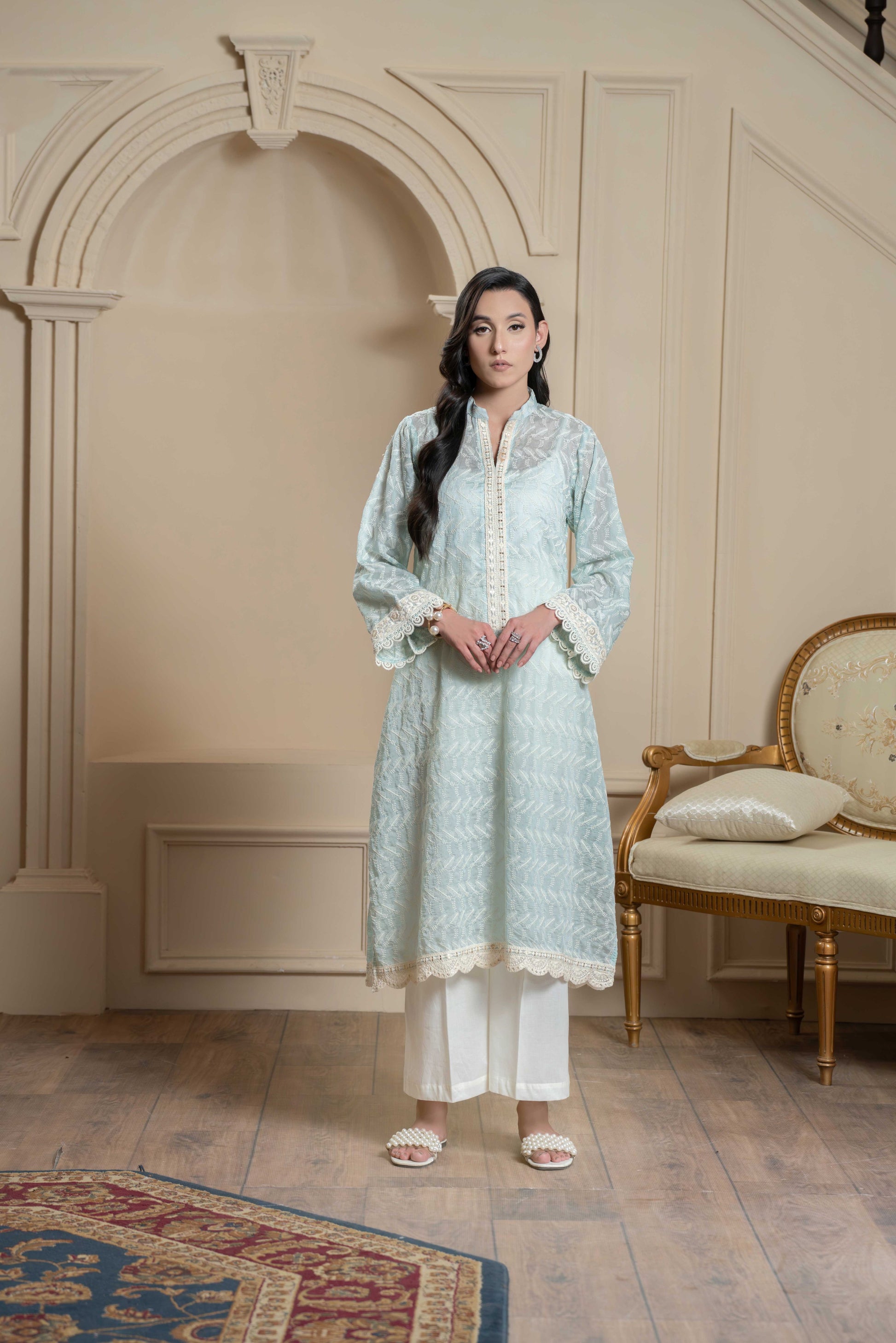 Fully embroidered shirt with embellished lace on sleeves and hem and lawn trouser (2 pc)