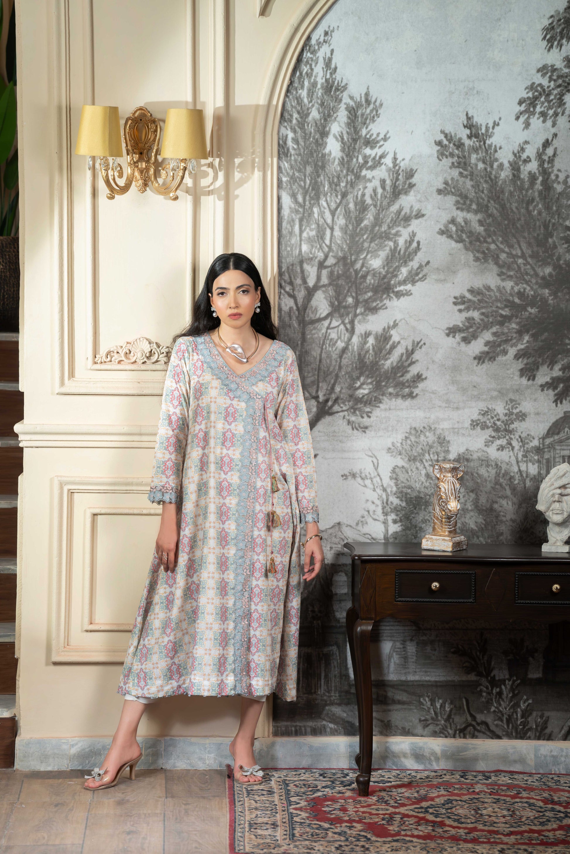 Lawn fully embroidered angrakha frock with tussles and embroidered lace and buttons on hem. 1 pc dress