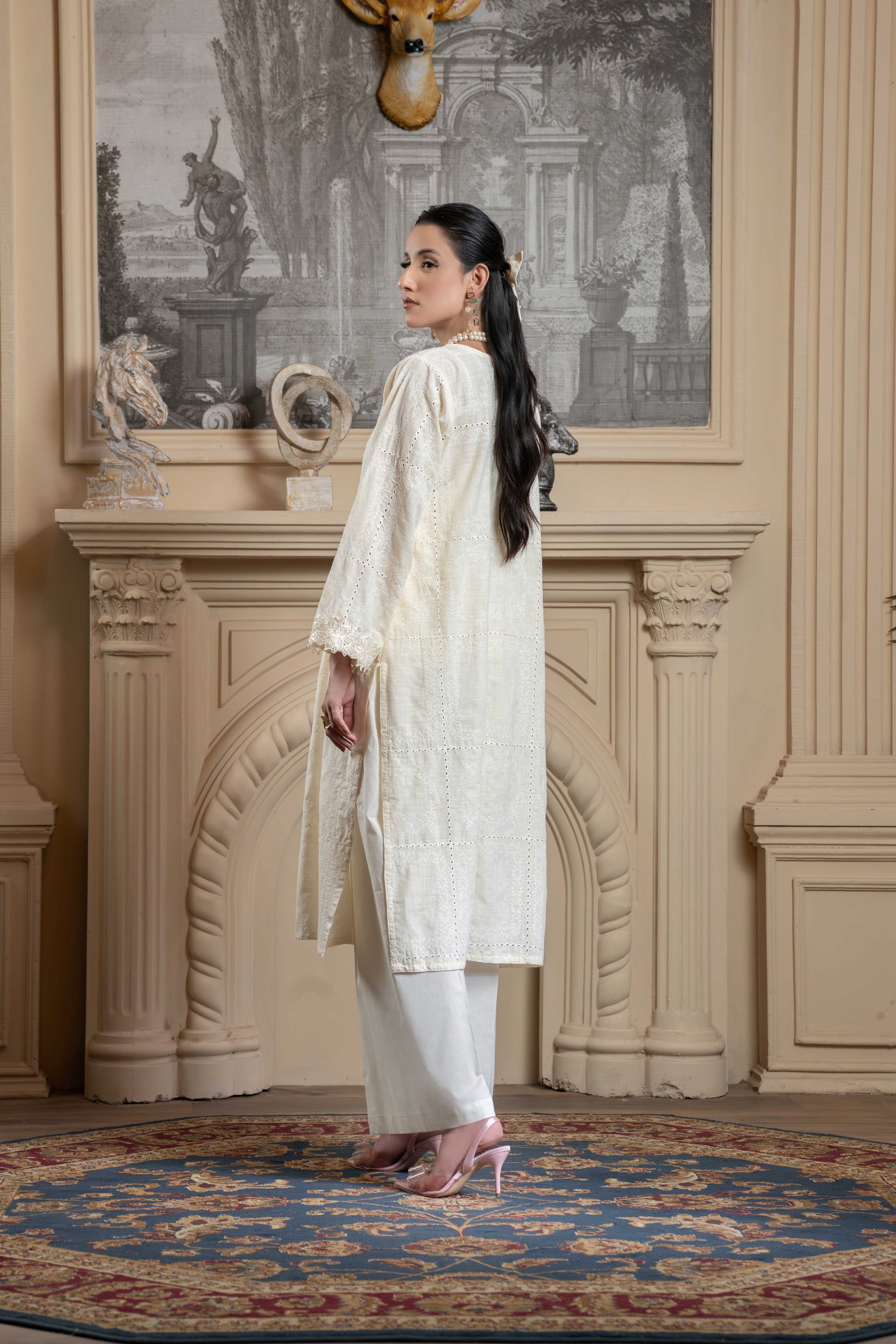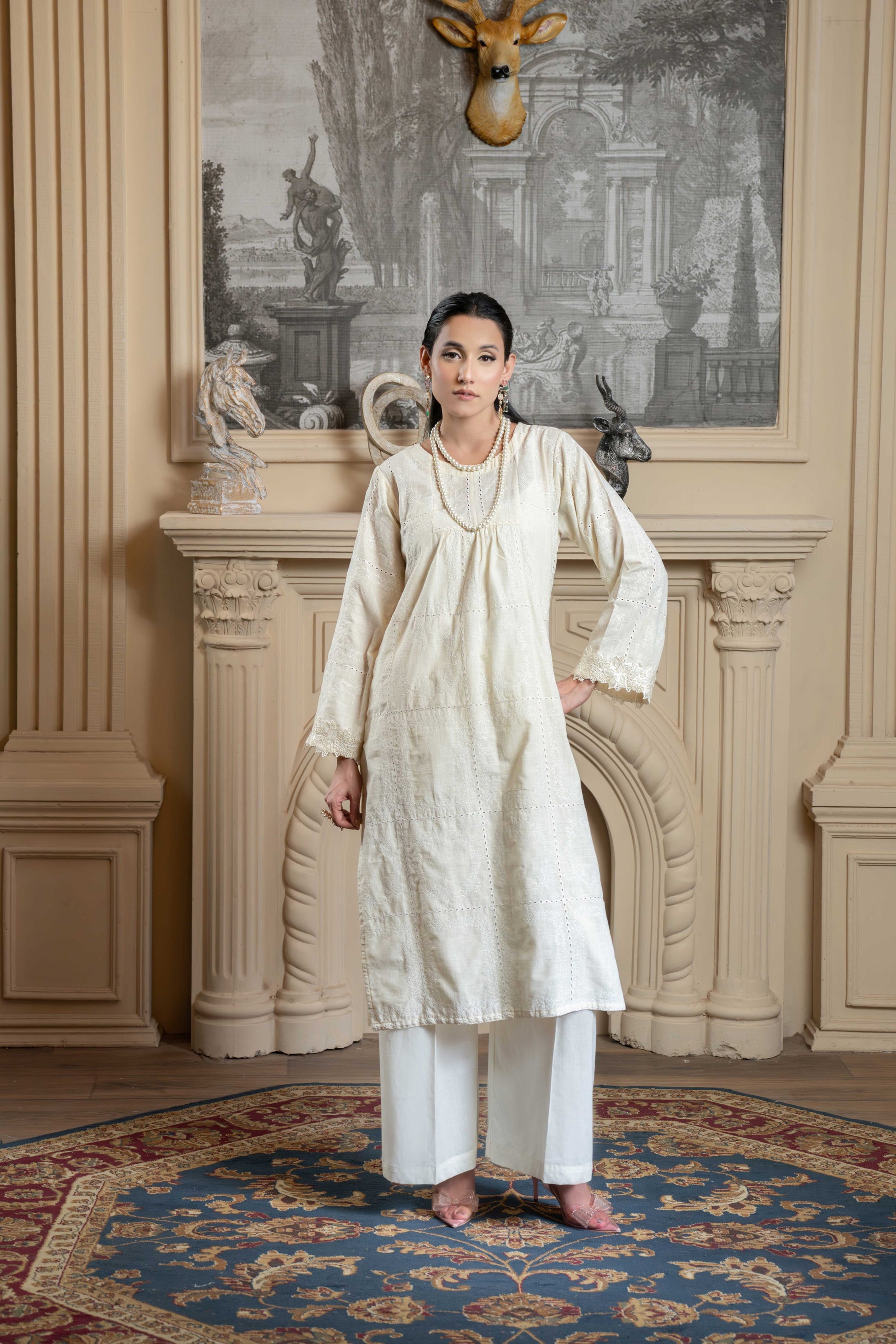 Fully embroidered cotton shirt with embellished lace on sleeves, gathers on neck and pair with trouser (2 pc)
