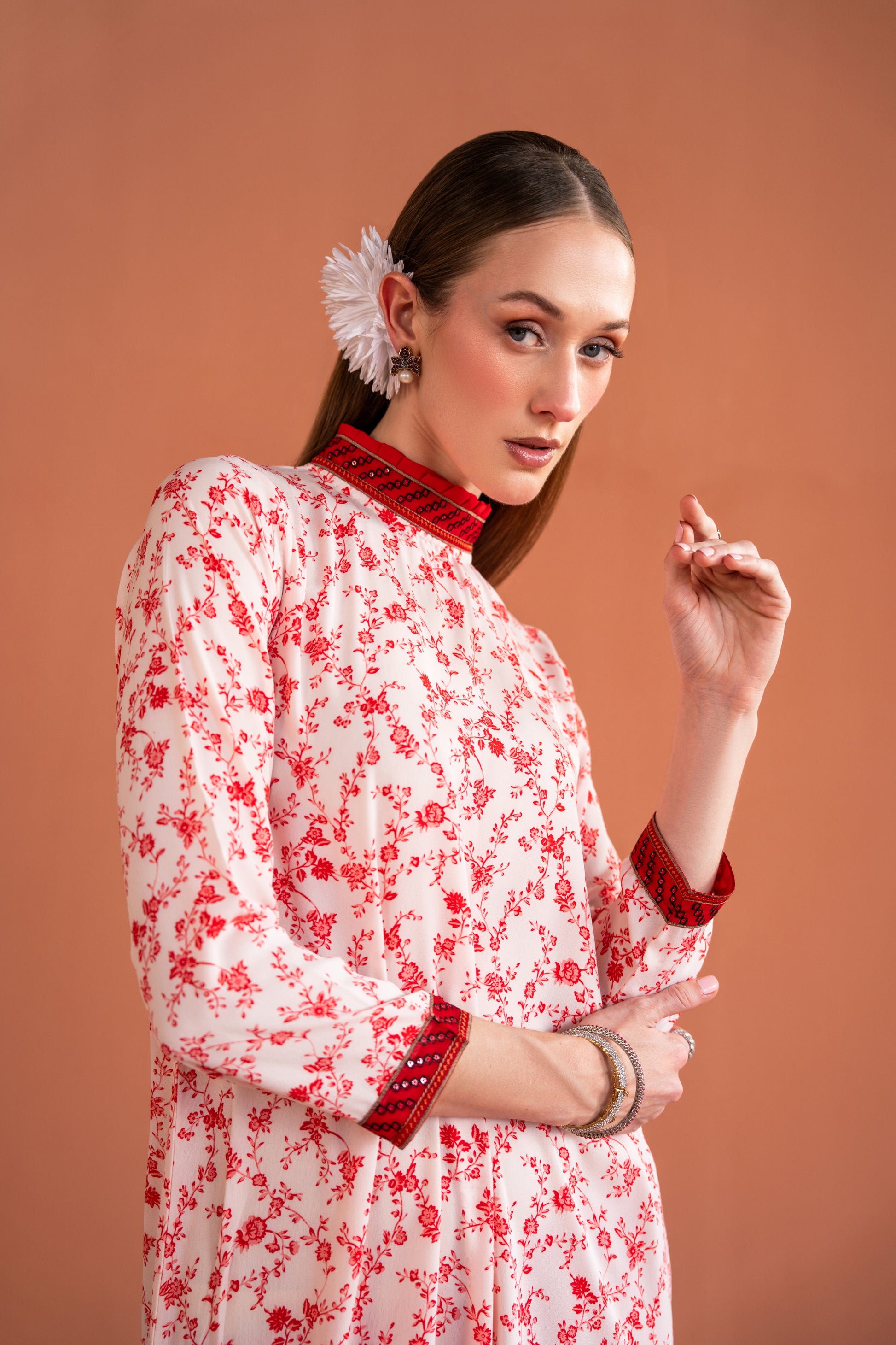 embroidered patches adorn the sleeves, daman, and neck, adding