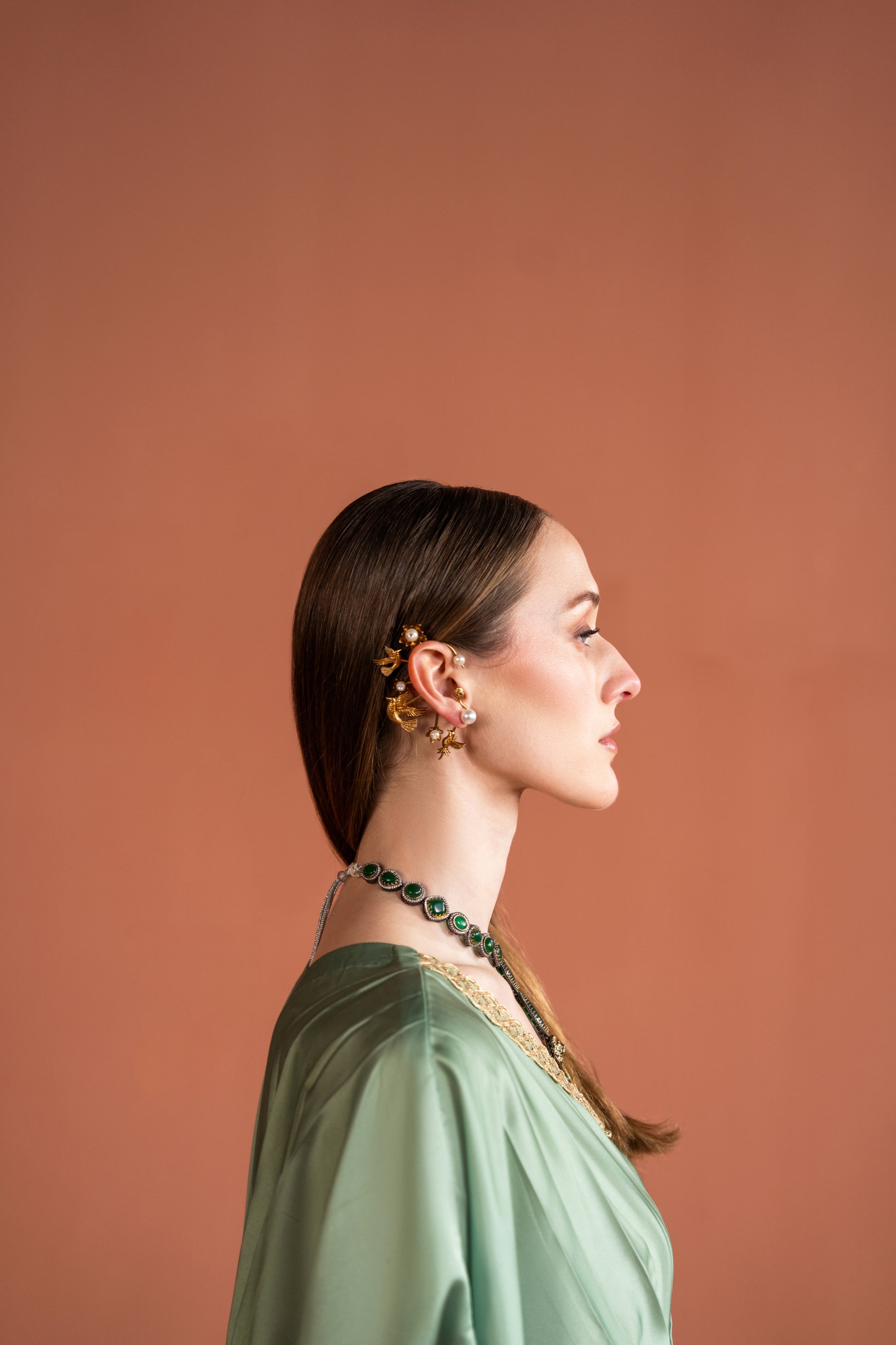 detailing graces the neckline, waist, and cuffs, adding a touch of refined